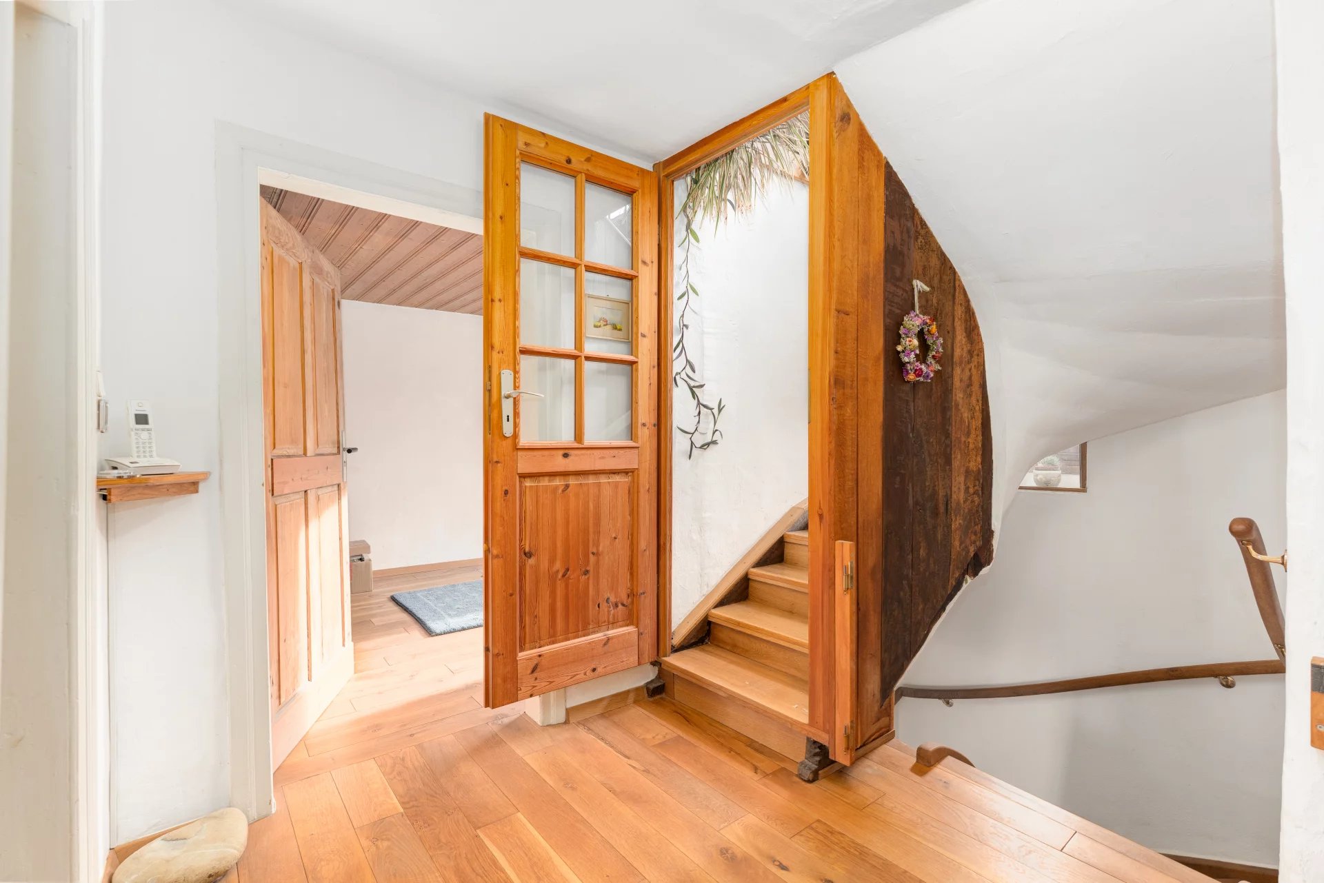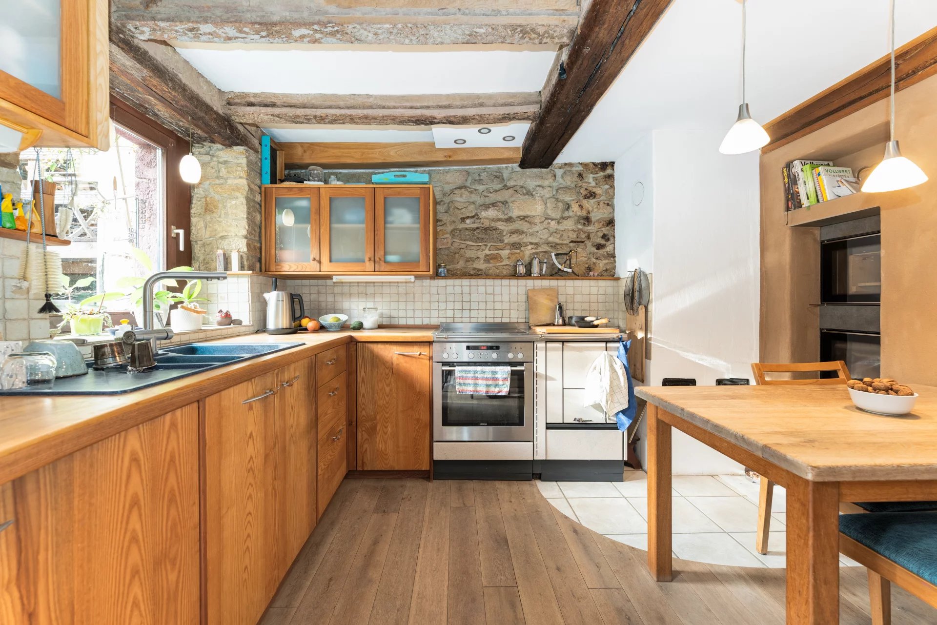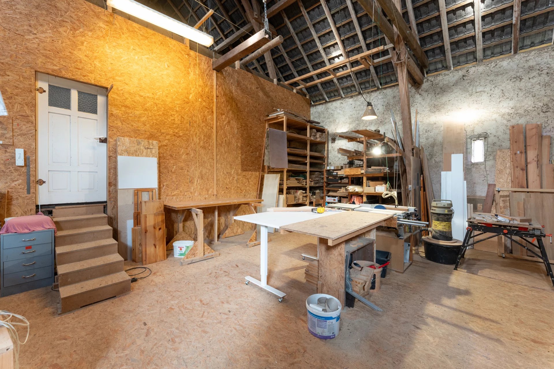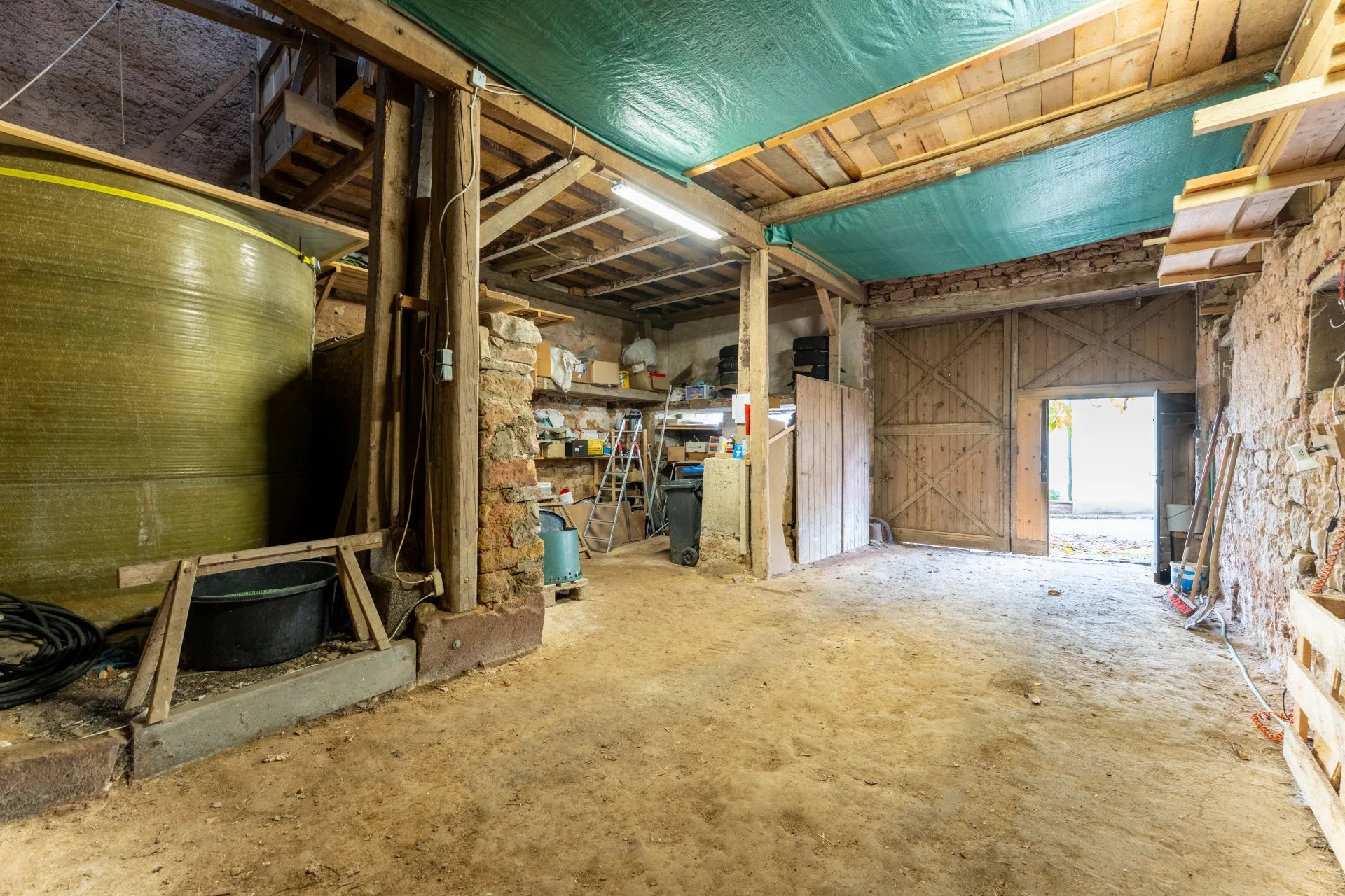 The adjoining barn, partially converted into a carpenter’s workshop, offers impressive volumes and numerous possibilities for conversion. A motor home can easily be accommodated in the garage, and several private parking spaces are available in front of the house.