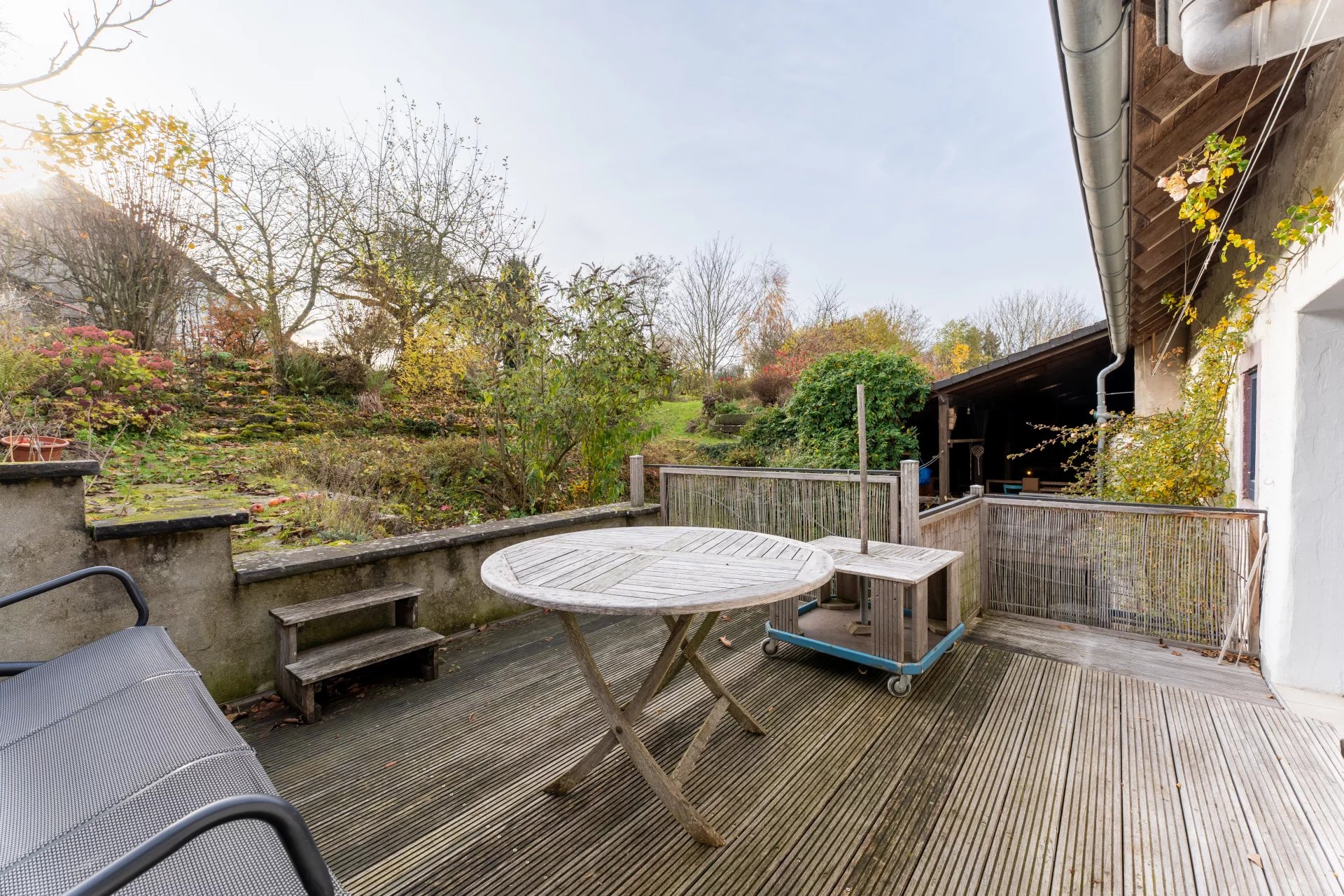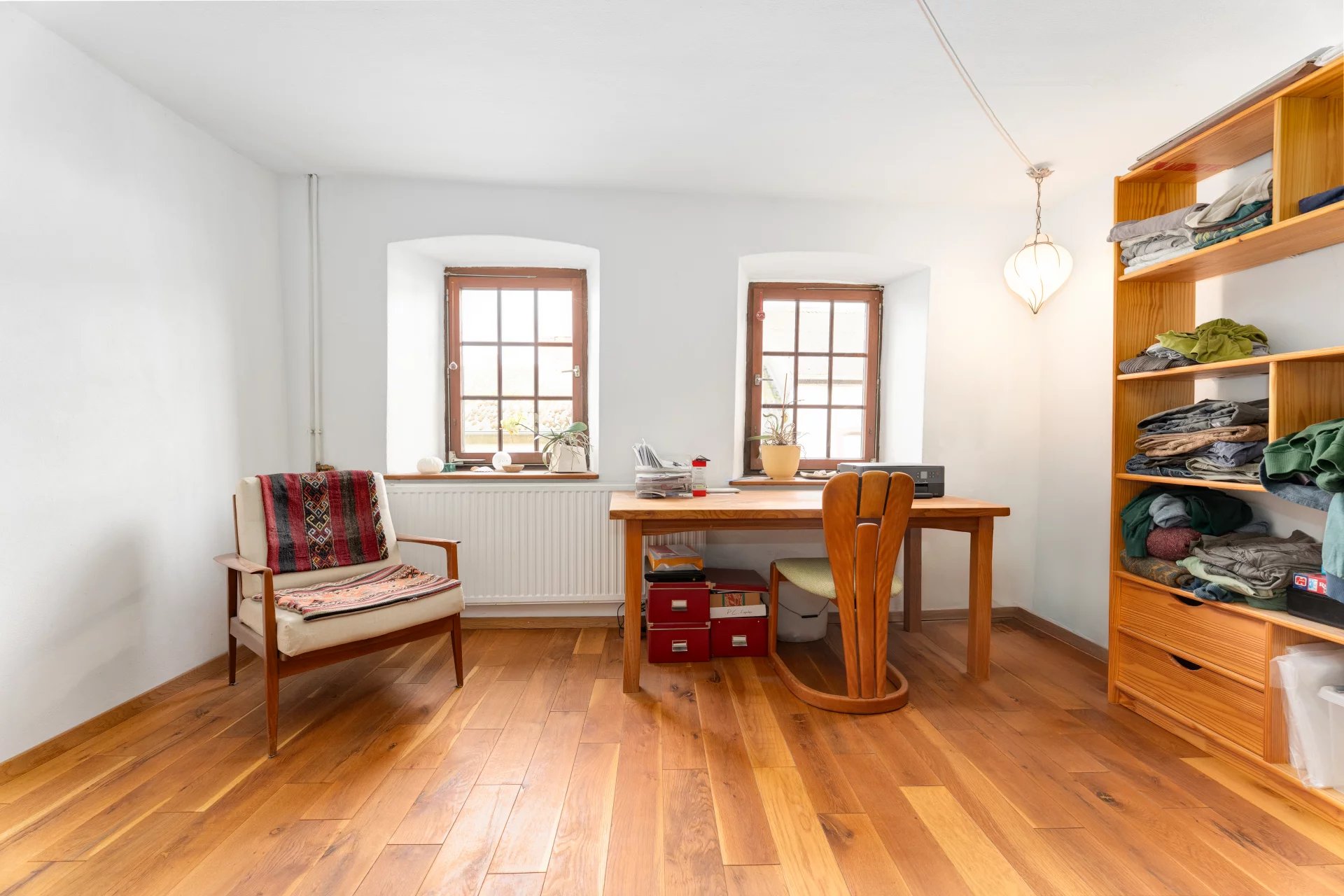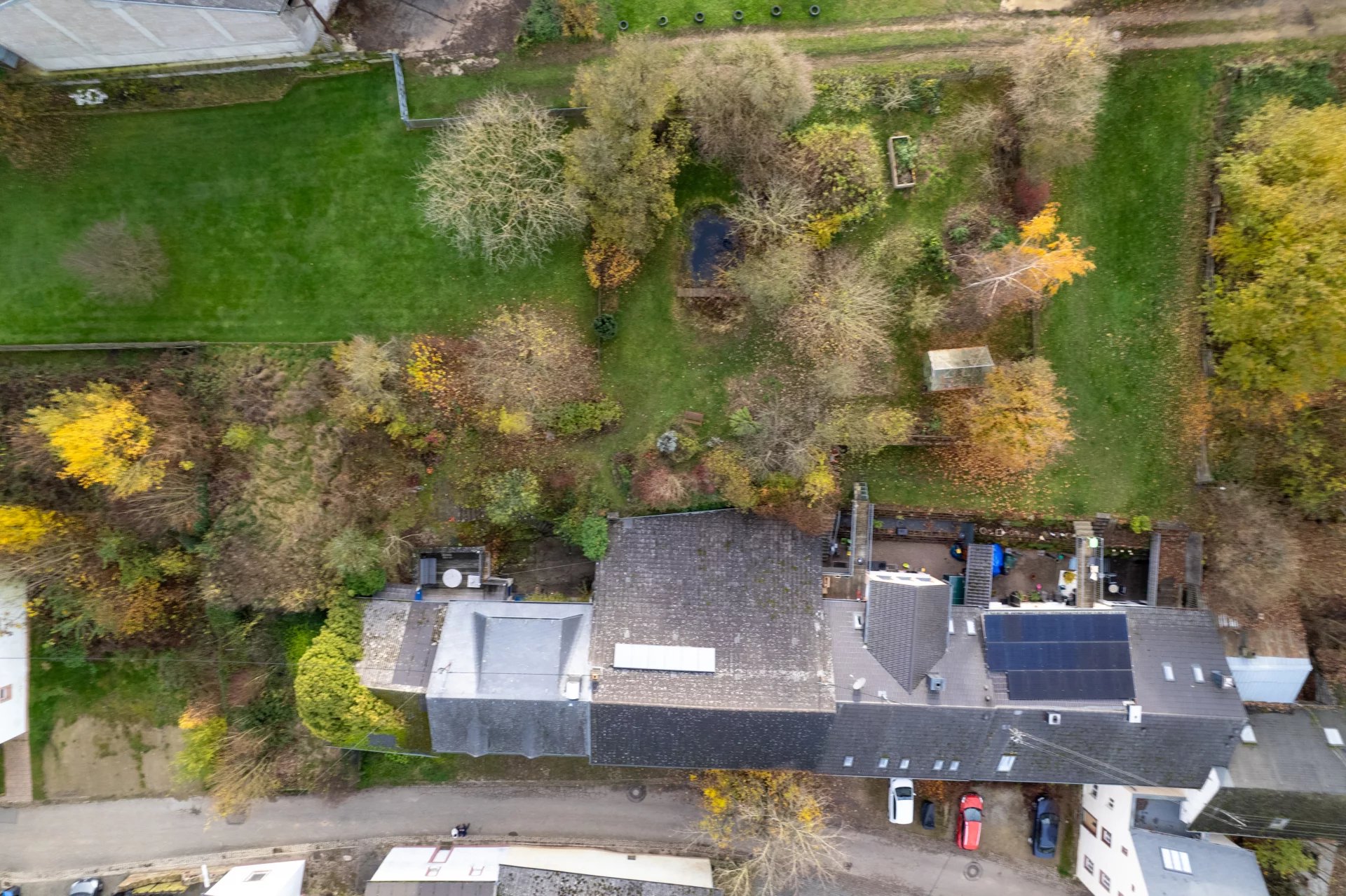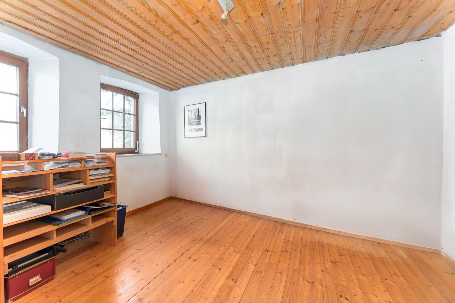 The spacious 60 m² top-floor room offers remarkable versatility: it may serve as an additional bedroom, a comfortable guest suite, or a large living or hobby space—ideal for both artistic pursuits and sporting activities. At the rear of the property, a beautifully wooded garden with fruit trees and a small pond completes this inviting setting.