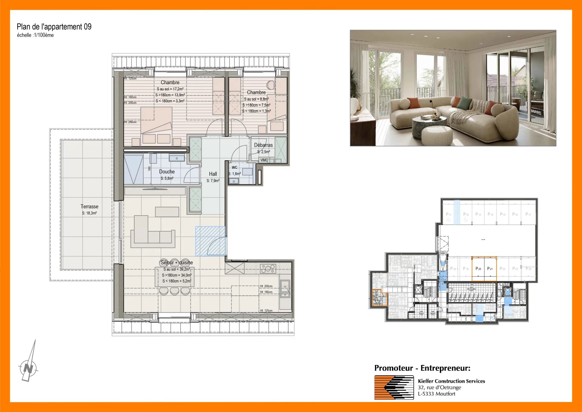 – Bright living room with open kitchen: approx. 34.0 sqm (over 1.80 m)