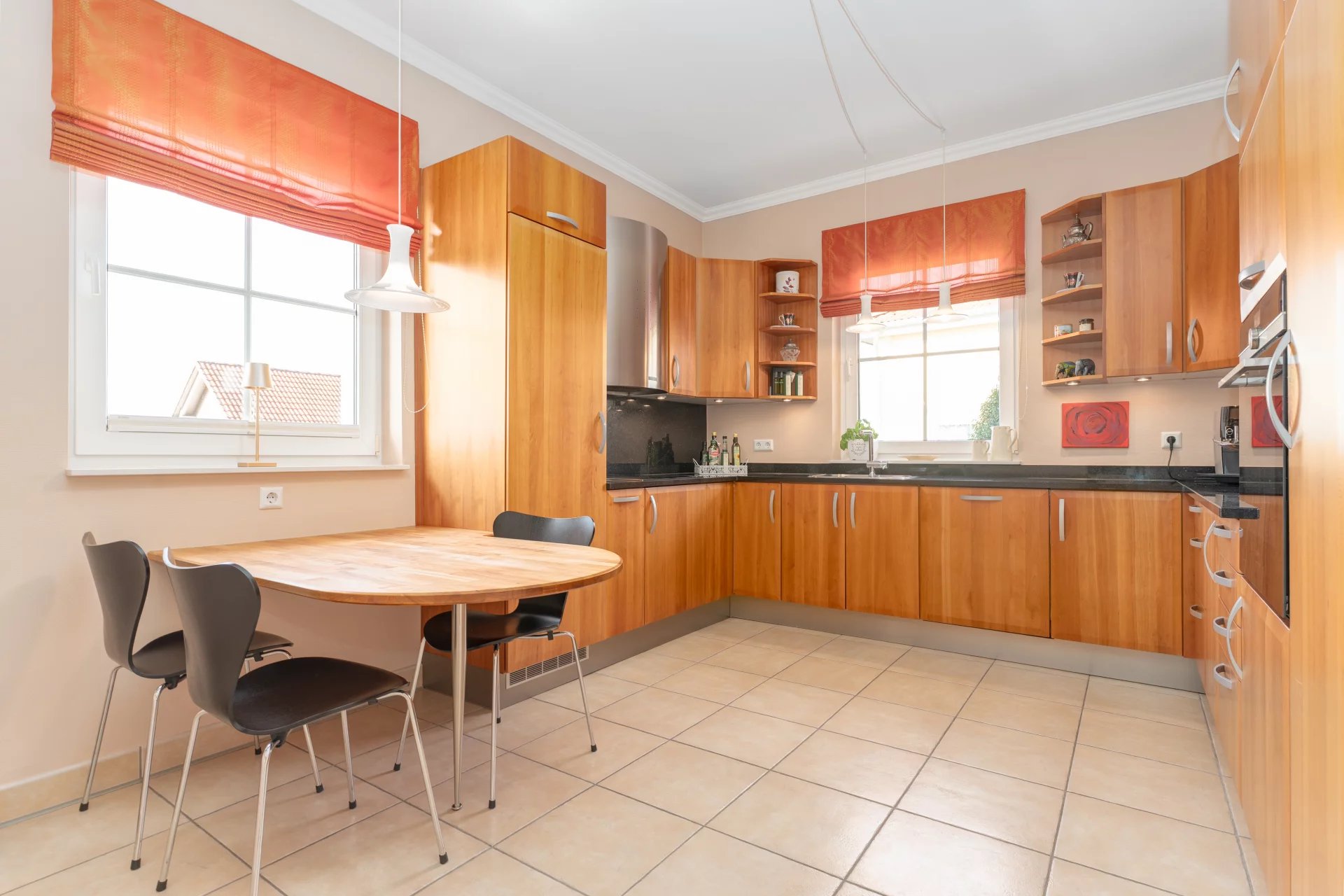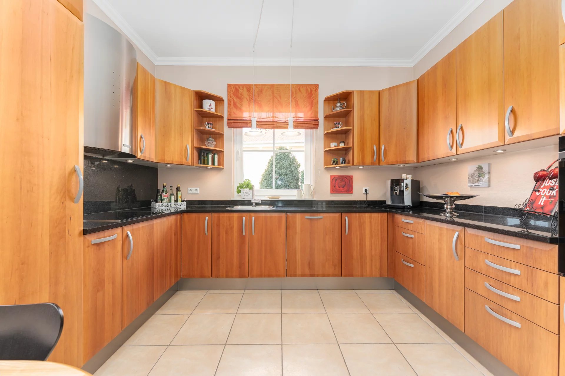 The 40.57 m² living room is the heart of the ground floor: flooded with light, with large French doors leading to the terrace and elegant stucco mouldings that lend the entire home its distinguished character. Two further rooms on the ground floor offer flexible usage options: a quiet home office (9.54 m²) – ideal for remote working – as well as a cosy TV room (13.03 m²) that can equally serve as an additional guest room. The ground floor is completed by a practical bathroom (4.32 m²) and a generous entrance hall (13.41 m²) serving as a connecting and storage space. The fully equipped kitchen (14.63 m²) is a true delight for cooking enthusiasts: cherry wood fronts, black granite worktop and a well-conceived U-shaped layout offering maximum working comfort and ample storage – premium quality in every detail.