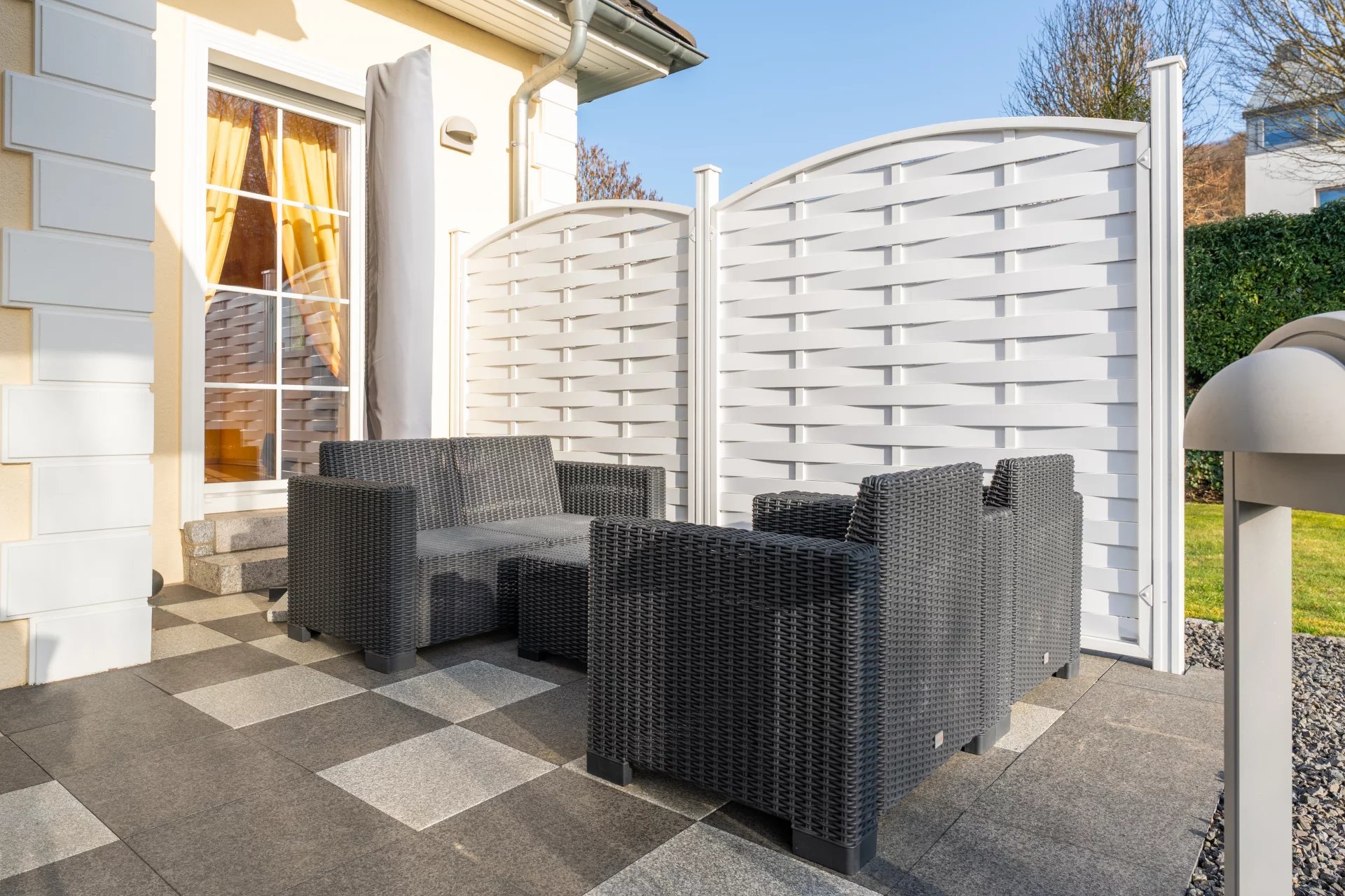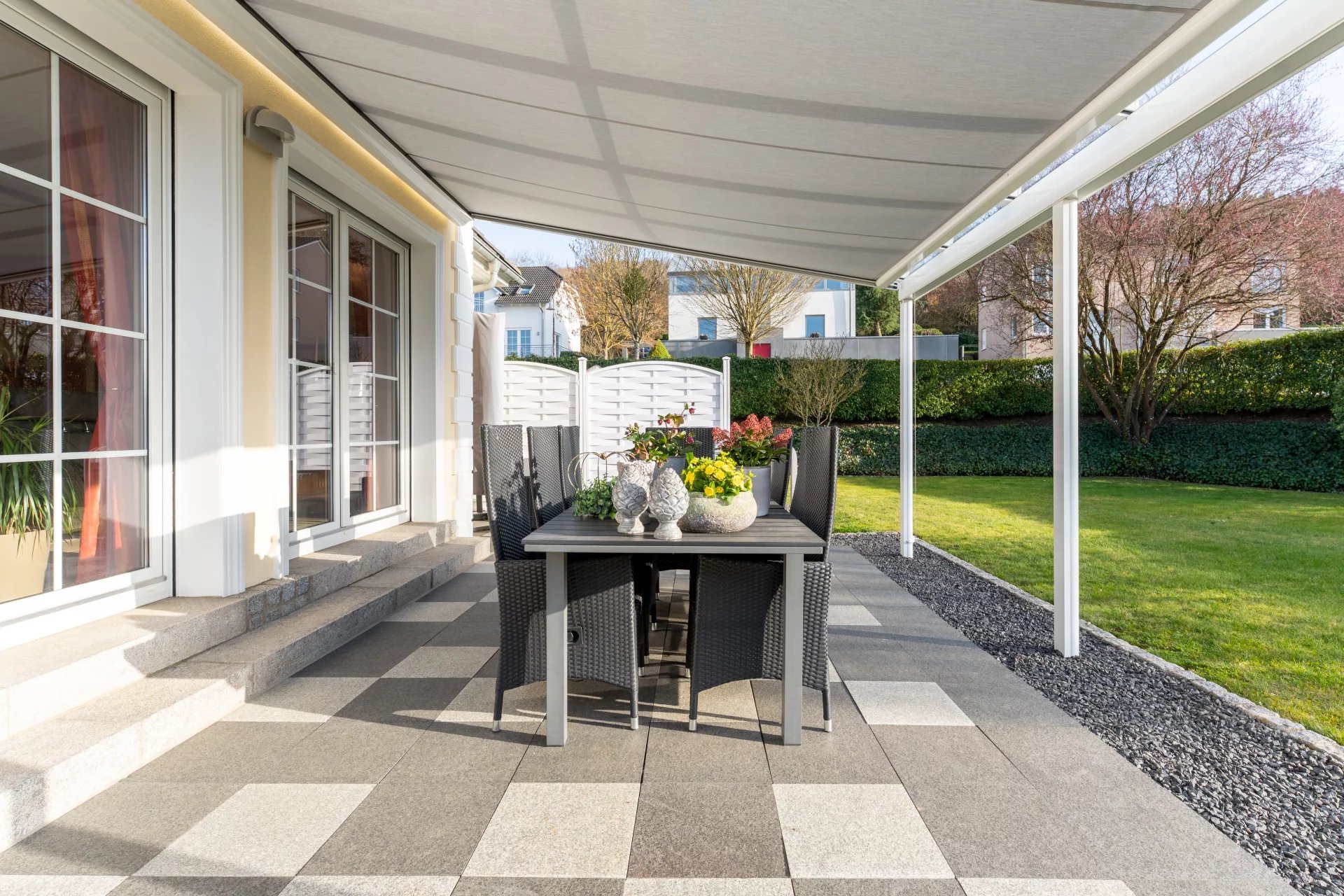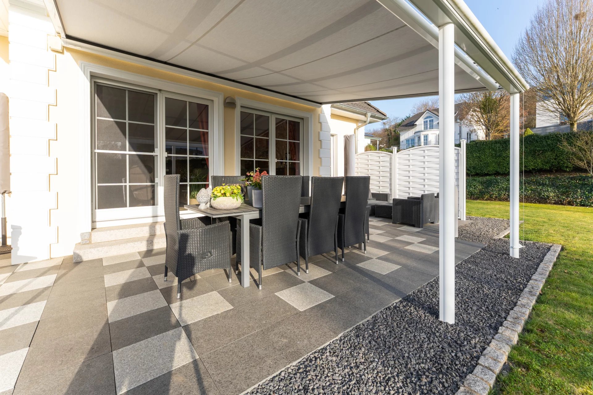 * Large south-facing terrace with high-quality granite slabs and a fixed canopy with electric awning – a weather-independent outdoor experience all year round